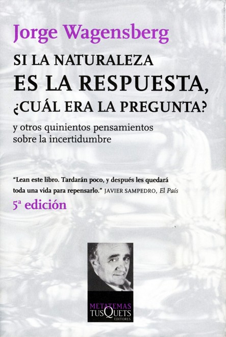 Podría decirse, pues, que esta colección de aforismos es el resultado de treinta años dedicados a preguntarse y explicarse la realidad. Su disposición en cuatro partes sugiere un asedio ordenado a cuanto nos intriga de nuestro complejo entorno: la Realidad («¿es el azar un producto de nuestra ignorancia o un derecho intrínseco de la naturaleza?»), la Vida («un raro estado de la materia inerte»), el Conocimiento («una representación finita de una complejidad infinita transmisible por vía no genética») y la Civilización («la ética es la estética del comportamiento»). A ratos vademécum de reflexiones autosuficientes, por momentos pequeño tratado con mínimos desarrollos lógicos, estos quinientos pensamientos sobre la incertidumbre sorprenden por lo novedoso de su perspectiva y por la agudeza con que tratan del azar y del tiempo, del arte y de la ciencia como formas complementarias de conocimiento, o de la convivencia y la transmisión de saber como pilares de una comunidad civilizada.