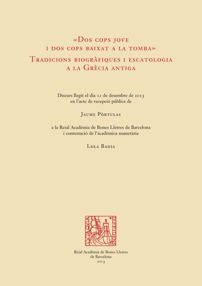 «Dos cops jove i dos cops baixat a la tomba». Tradicions biogràfiques i escatologia a la Grècia antiga és el títol de l?estudi que Jaume Pòrtulas exposà en l?acte d?ingrés a la Reial Acadèmia de Bones Lletres de Barcelona, un treball en què l?autor analitza una sèrie de contalles sobre certs persona...