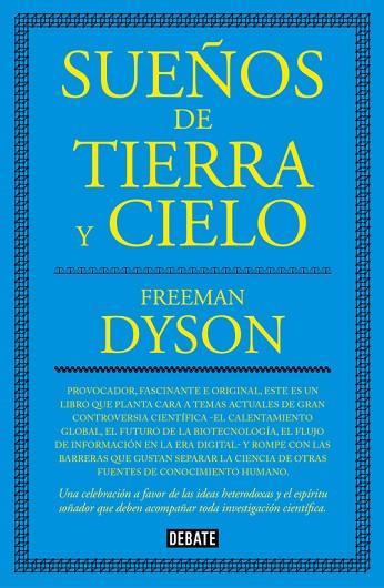 Escrito de manera provocadora, rozando incluso lo políticamente incorrecto, Sueños de tierra y cielo planta cara a temas actuales de gran controversia científica -el calentamiento global, el futuro de la biotecnología, el flujo de información en la era digital- y rompe con las barreras que gustan separar la ciencia de otras fuentes de conocimiento humano.