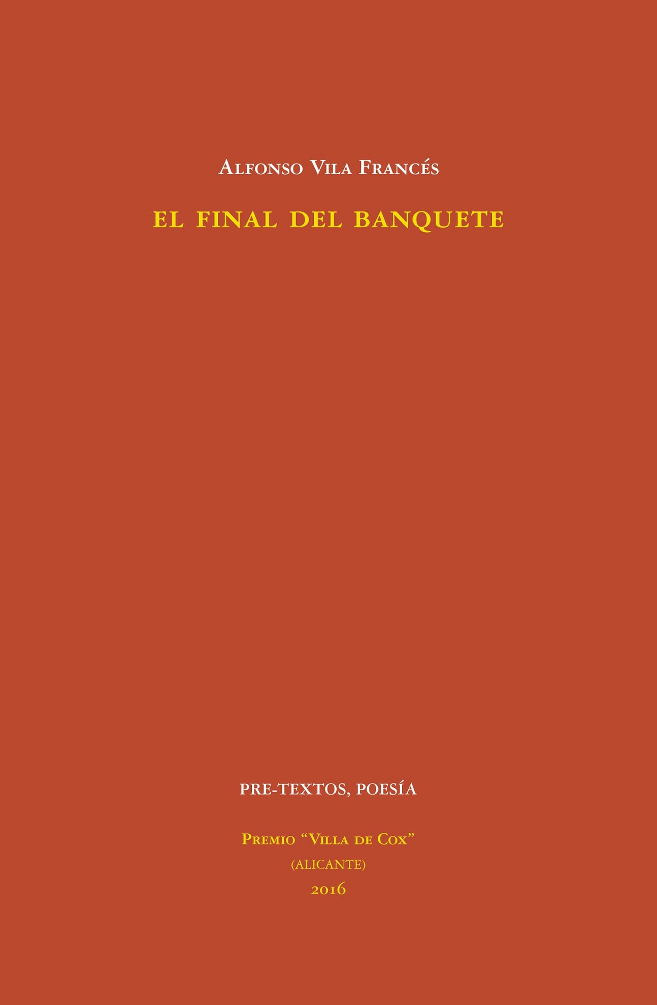 ALFONSO VILA FRANCÉS nació en 1970 en Valencia, donde actualmente reside. Ha vivido en Orihuela, Madrid, Bruselas, Alicante y Debrecen (Hungría). Ha trabajado en una cuantas cosas: monitor de tiempo libre, bibliotecario, archivero, profesor de secundaria, etcétera. Ha escrito en muchas revistas, entre otras: Cuadernos del matemático, Dos Disparos, Groenlandia, La Bolsa de Pipas, Fábula, El Coloquio de los Perros, Hypérbole, Papel de Periódico, El Cotidiano, Culturamas, La Soga, Le Miau Noir y Jot Down. También ha ganado algunos premios (entre ellos Miguel de Cervantes, Jaume Roig, Diputación de Castellón, Cortes Valencianas, Dionisia García y Mariano Roldán). Ha publicado varios libros de investigación histórica, un libro de relatos y cinco poemarios: Historias de fantasmas (2000), A golpe de palabras (2001), Hacia otra luz (2003), Acto de clausura (2013) y Tiempo muerto (2016).