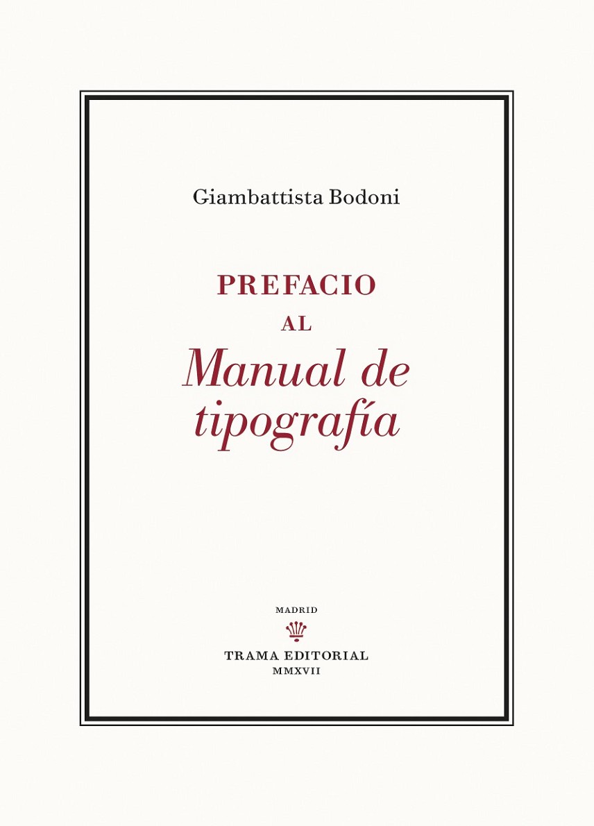 El MANUAL DE TIPOGRAFÍA de Giambattista Bodoni es uno de los mayores éxitos tipográficos de la historia, y el PREFACIO incluye los textos introductorios. Bodoni publicó la primera edición del MANUAL en 1788, pero continuó trabajando en esta obra veinticinco años más. A su muerte en 1813, es su viuda la que continuó con su labor y publicó en 1818 la edición final: más de seiscientas láminas, con juegos de tipografías en redondas y en cursivas, alfabetos de otras lenguas, series de ornamentos, viñetas, florituras... Margherita dall?Aglio dedica el Manual a la archiduquesa María Luisa de Austria, duquesa de Parma, Piacenza y Guastalla, ?por saberla protectora de las Ciencias y las Bellas Artes?, y lo presenta al público con un discurso ?Al lector?, en el que cuenta las circunstancias favorables y adversas que se dieron desde que su ?amado esposo? decidió emprender esta colosal tarea. El Prefacio de Bodoni comienza con estas líneas: ?He aquí el fruto de mi industria y mis desvelos de muchos años...? y es toda una disertación sobre el arte y la belleza de las letras. La fuente Bodoni se utiliza hoy en medios digitales e impresos. Por su elegancia y clasicismo, es la tipografía de logos de marcas muy conocidas, como Vogue, Calvin Klein, Elizabeth Arden, Ralph Lauren...