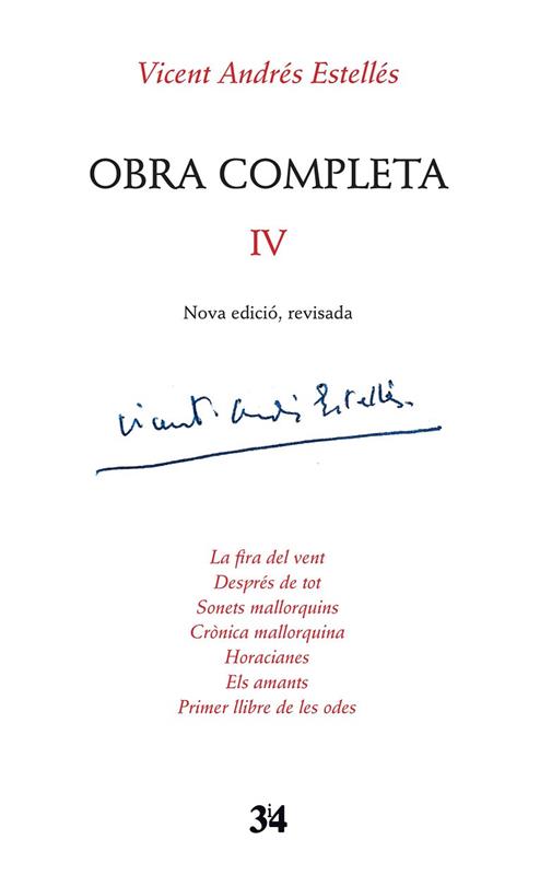 Aquesta Obra Completa -Nova edició, revisada- constitueix un nou projecte d'edició de l'obra estellesiana que conté estudis introductoris, un treball de reorganització cronològica de les obres i d'edició filològica dels poemes estellesians. En aquest quart volum s'apleguen les següents obres: La fira del vent, Després de tot, Sonets mallorquins, Crònica mallorquina, Horacianes, Els amants i Primer llibre de les odes.