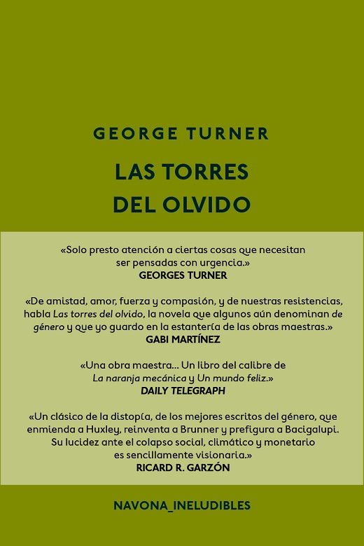 "Si George Turner lo publicó en 1987 y su propuesta continúa tan vigente, será porque se trata de un clásico. Dicen que Las torres del olvido es una novela de ciencia ficción. Algunas etiquetas la distinguen como «la primera gran novela del subgénero cambio climático». Son formas de hablar sobre una obra que anticipó con inquietante exactitud el mundo que está llamando a nuestra puerta." Gabi Martínez