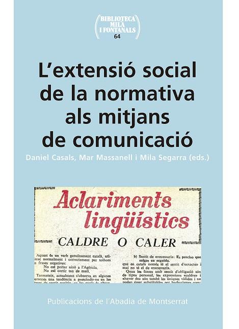 Els mitjans de comunicació de massa són agents actius en el procés d'estandardització de la llengua. Són decisius en la fase d'extensió social de l'estàndard perquè posen la població en contacte amb aquesta varietat. Com a resultat del compromís social amb la comunitat, el periodisme contemporani ha elaborat un gènere destinat a difondre coneixements lingüístics, sobretot normatius. La presència d'aquests temes a l'espai públic ha estat sostinguda en el temps i és independent del context sociopolític i de l'estatus jurídic que, en cada moment, ha tingut l'idioma. Per aquesta raó avui comptem amb una tradició sòlida d'espais sobre la llengua catalana presents a la premsa, la ràdio i la televisió, que també ha arribat als nous formats digitals. El present volum és el resultat d'un projecte de recerca que té l'objectiu d'analitzar un conjunt de columnes o programes sobre el català que han aparegut als mitjans de comunicació escrits i orals. En aquest llibre, editat per Daniel Casals, Mar Massanell i Mila Segarra, i prologat per M. Teresa Cabré Castellví, hi participen investigadors universitaris i responsables d'algunes de les seccions objecte d'estudi, com ara Joan A. Argenter, Emili Casanova, Daniel Casals, Neus Faura, Josep Gifreu, Albert Jané, Georgina Jordana i Núria Puyuelo.