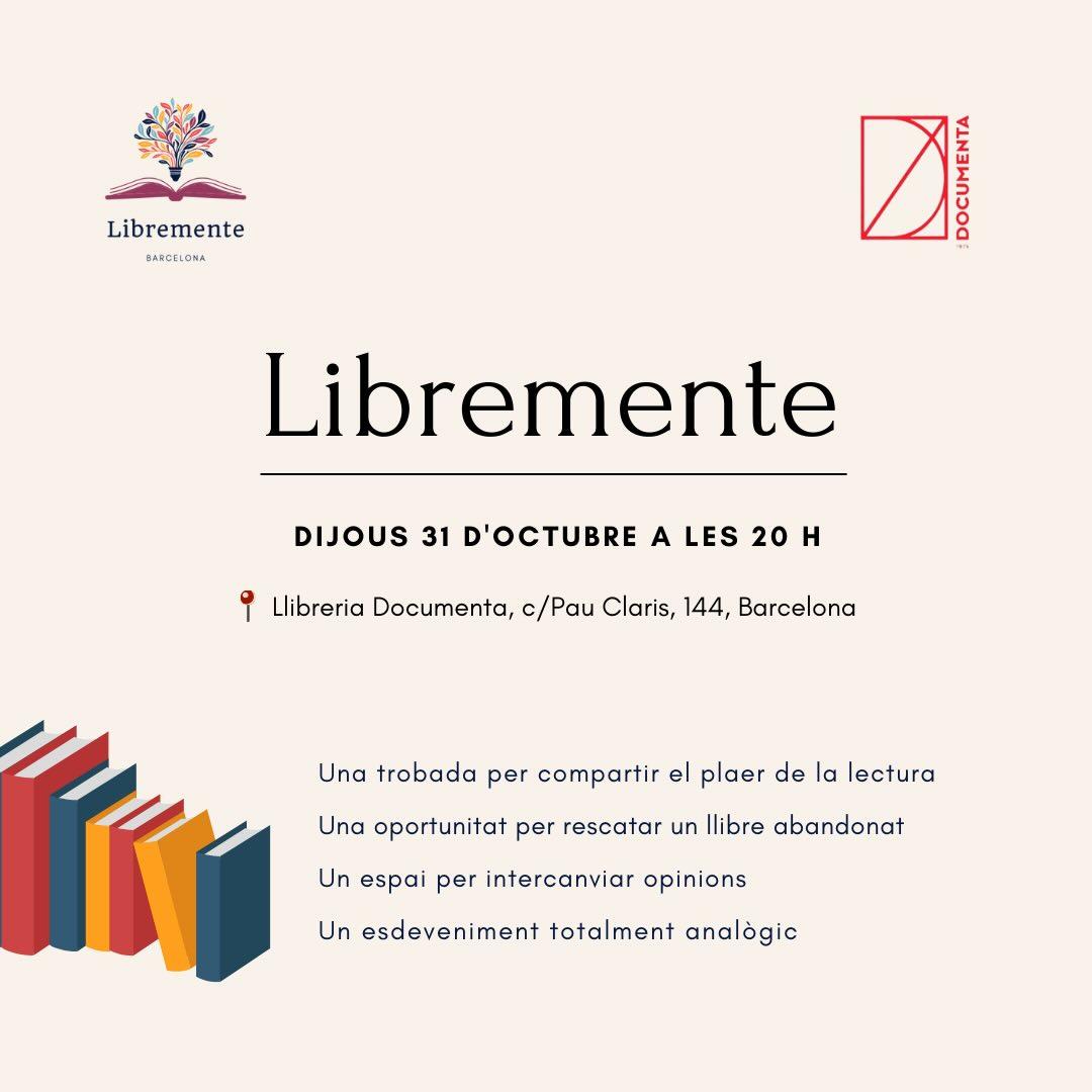"Libremente" no és un club literari, sinó un espai compartit de desconnexió digital i dedicació a la lectura. Si t'agrada llegir, però mai trobes el moment adequat en la voràgine de les teves activitats diàries, o si vols tafanejar què hi ha de nou en la llibreria Documenta, aquest és el teu lloc!