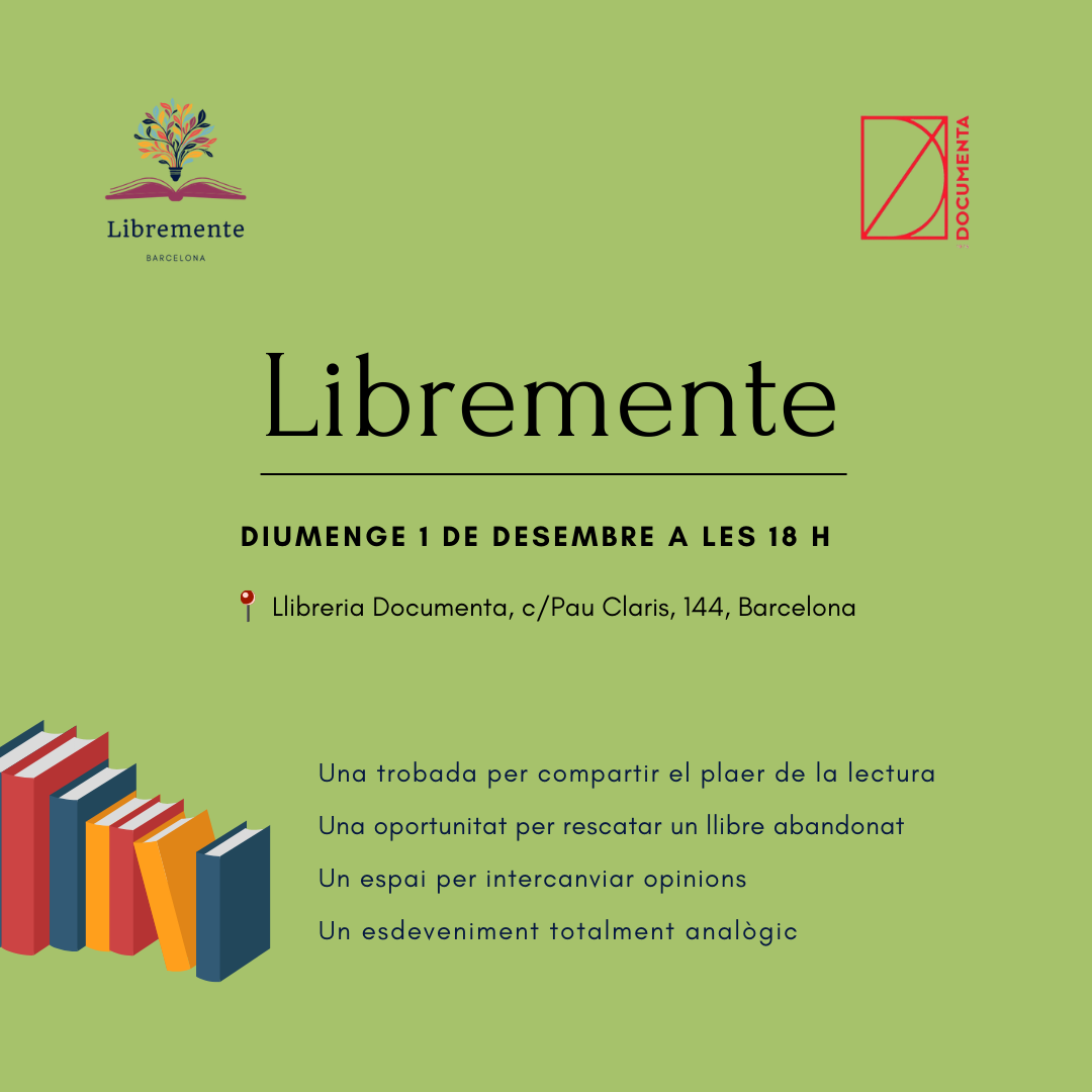Libremente no és un club literari, sinó un espai compartit de desconnexió digital i dedicació a la lectura. Si ets una rata de biblioteca, si t'agrada llegir però mai trobes el moment adequat en la voràgine de les teves activitats diàries, o si vols tafanejar què hi ha de nou en la llibreria Documenta, aquest és el teu lloc! En què consisteix aquest esdeveniment? Vine a la llibreria, asseu-te en una butaca i obre el teu llibre: no necessites res més. Tria lliurement la teva lectura. Llegirem durant una hora de manera individual i després compartirem la nostra experiència lectora, lliurement també.