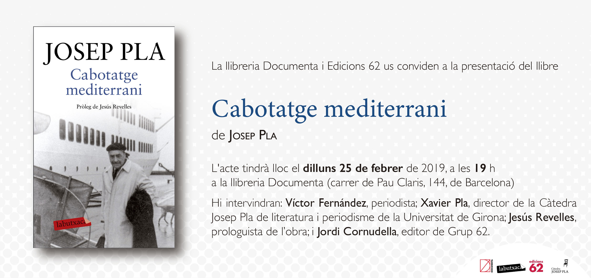 Edicions 62 i la llibreria Documenta us convidem a la presentació de Cabotatge mediterrani, de Josep Pla. Com apunta el professor Jesús Revelles i Esquirol en el pròleg