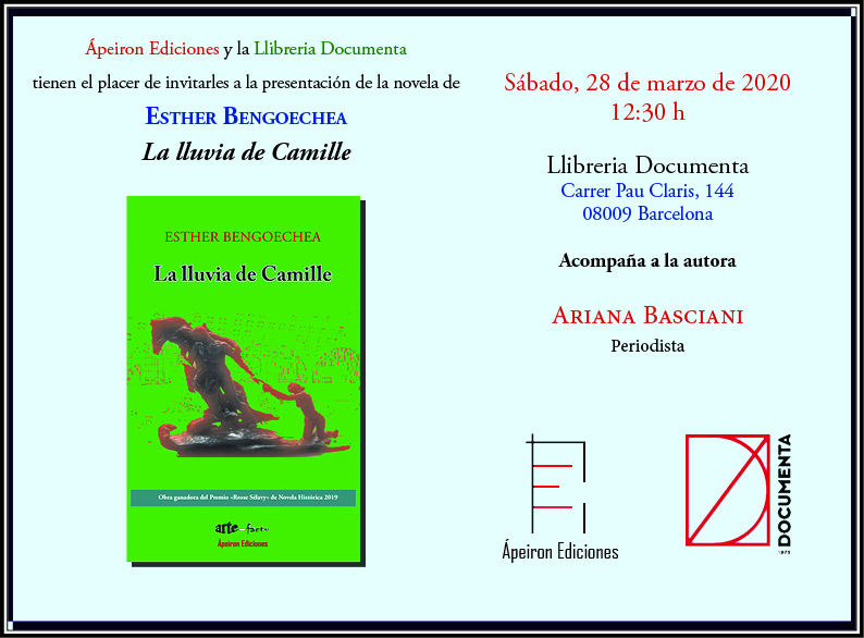 Apeiron Ediciones y Llibreria Documenta les invitan a la presentación de la novela "La lluvia de camille" d'Esther Bengoechea.