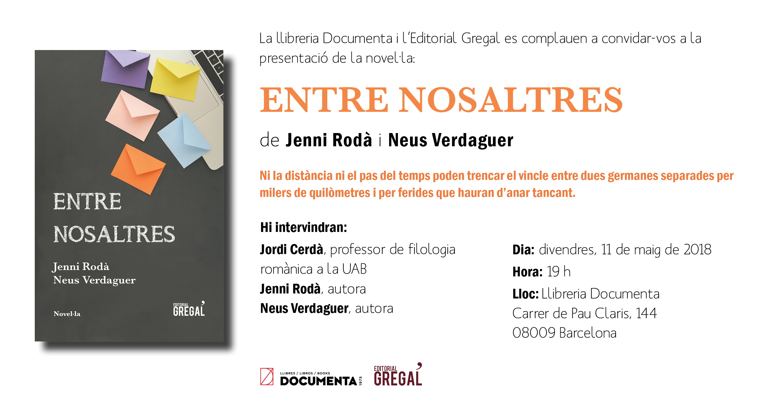 L'Editorial Gregal i la llibreria Documenta us convidem a la presentació de la novel·la Entre nosaltres, de Jenni Rodà i Neus Verdaguer.