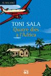 Dictadures, misèria, illes i palmeres, goril·les, cocodrils i aventures. A través del viatge d?uns dies al cor del continent africà, Toni Sala ens proposa una reflexió sobre l?actualitat literària de l?aventura i sobre un dels temes que fan córrer més tinta últimament: el diàleg intercultural. Més enllà de la retòrica i dels tòpics, ¿podem fer compatible la diversitat amb la pròpia cultura? Quatre dies a l?Àfrica és el relat d?un viatge tan divertit com seriós, amb avioneta, cayuco, quatre per quatre o a peu, per constatar, sobre el terreny i sobre un mateix, que el tracte amb els altres no és una qüestió banal, ni gens fàcil.L?estil precís, l?observació aguda i la destresa narrativa que tants lectors van apreciar en la Petita crònica d?un professor a secundària, i que impregna tota l?obra de Toni Sala, són també els puntals que fan d?aquests Quatre dies a l?Àfrica una festa de la intel·ligència i una lectura deliciosa.Toni Sala va néixer a Sant Feliu de Guíxols l?any 1969. El seu primer llibre, Entomologia (1997), va guanyar el Premi Documenta. Pere Marín (1998) va ser la seva primera novel·la. Amb Bones notícies (2001) va proposar una mirada torbadora a les intimitats de la vida en parella. Petita crònica d?un professor a secundària (2001) va donar-lo a conèixer al gran públic. Amb Goril·la blanc (2002) va introduir-se en el gènere de l?autobiografia. A Un relat de la nova immigració africana (2003) va narrar les aventures d?un gambià a Catalunya. La seva novel·la Rodalies (2004) va guanyar el premi Sant Joan. Totes aquestes obres són al catàleg d?Edicions 62.
