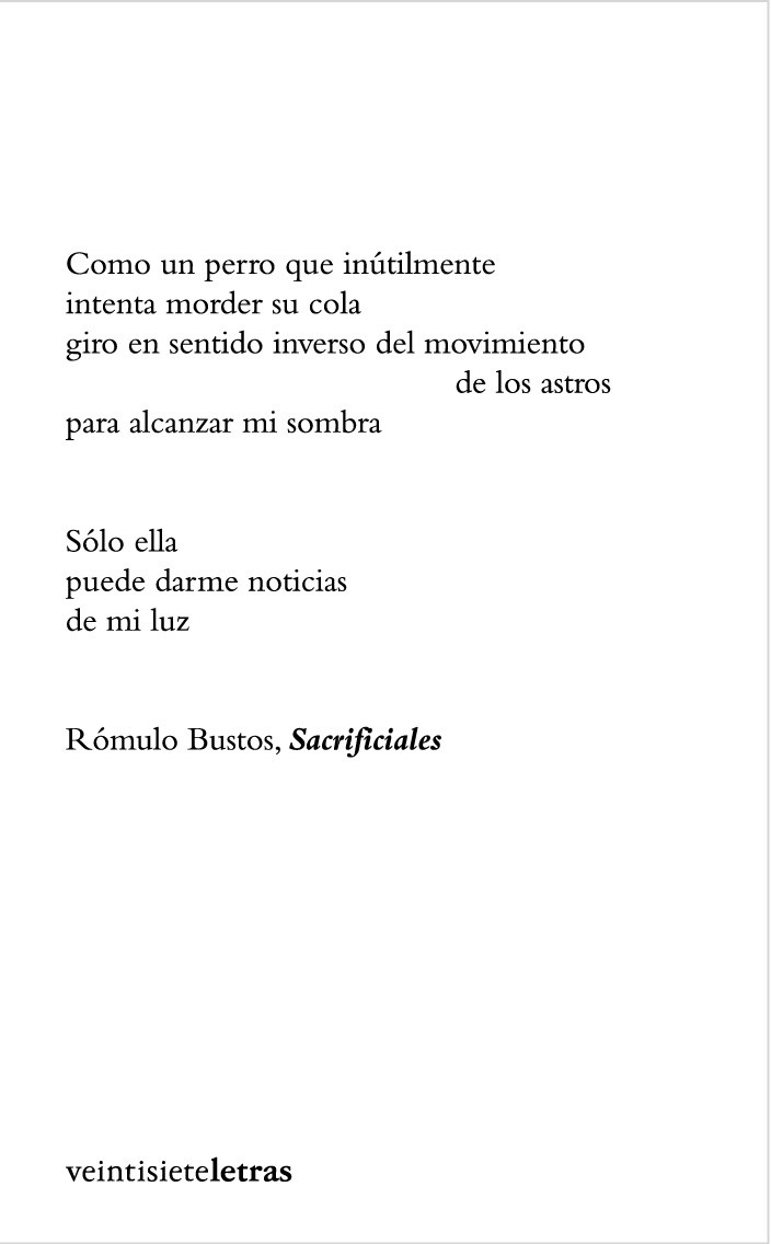 El autor reflexiona en sus versos sobre el quehacer poético; y su palabra se detiene en la estancia idealizada de la niñez. Pero también recoge su preocupación por la vida del hombre de hoy; se pregunta por la divinidad y aspira a la «empresa prometeica» de crear un nuevo espacio sagrado frente al vacío existencial de nuestro tiempo. Busca un poema luminoso, pulido, breve, dispuesto a transitar territorios que el discurso ordinario rehúye o aborda de modo convencional. Rómulo Bustos (Santa Catalina de Alejandría, 1954), premio nacional en dos ocasiones, está considerado como uno de los grandes poetas colombianos vivos.