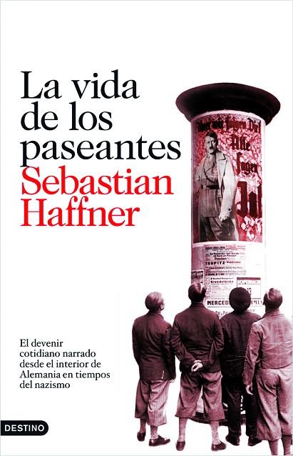 La vida de los paseantes reúne treinta y nueve artículos de Sabastian Haffner un auténtico ario que en 1938 se exilió a Inglaterra, escritos entre 1933 y 1938, en los primeros años de la época nazi, un período caracterizado, como escribió el autor, «porque de puertas afuera la vida apenas sufrió alteraciones: los cines, los teatros y los cafés estaban llenos, los paseantes deambulaban ingenuos por las calles». Una época en que los «aullidos de guerra amenazadores tratan de privar [a los paseantes] de su única defensa: de su entendimiento». Esta obra es un muestrario de la mejor prosa periodística de la época. Los relatos, articulados en torno a hechos o detalles cotidianos están escritos con un estilo brillante, a menudo jugoso y siempre agudo.