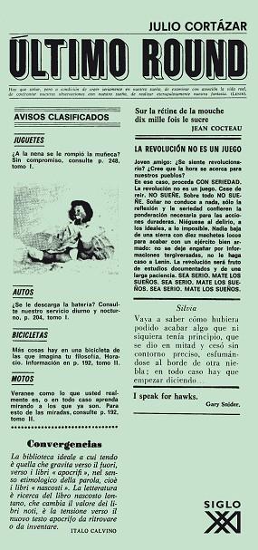 Maquetada de forma singular, Último round (1969) se divide en dos volúmenes que invitan al lector al juego (una intención que el autor ha remarcado en obras como Rayuela o 62/Modelo para Armar) desde su portada cubierta de pequeños fragmentos textuales a modo de sección de anuncios de diario. Si hub...