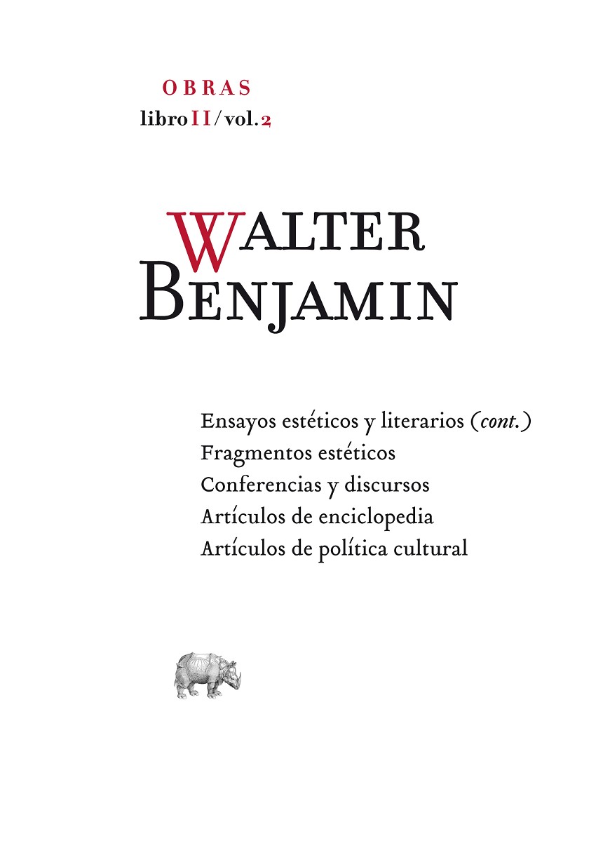 Se trata del cuarto de los once volúmenes de esta edición realizada a partir de la publicada en Alemania por la prestigiosa Suhrkamp Verlag, en edición de Rolf Tiedemann y Hermann Schweppenhäuser (con la colaboración de Theodor W. Adorno y Gerhom Scholem). Incluye los «Ensayos estéticos y literarios (cont.)», «Fragmentos estéticos», «Conferencias y discursos», «Artículos de enciclopedia» y «Artículos de política cultural».