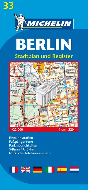 Encuentre todas las informaciones prácticas para recorrer Berlín a pie, en coche o en bicicleta. El plano MICHELIN Berlín, a escala 1/22 000 (1cm = 220 m), es ideal para recorrer la ciudad del castillo de Charlottenburg, las calles de moda y disfrutar de sus numerosos parques y museos. Para completar la información incluye: plano de transportes, calles peatonales, sentidos de circulación, parkings... y un anexo con el índice de todas las calles. Incluye signos convencionales en castellano, italiano, inglés, francés, alemán y neerlandés.
