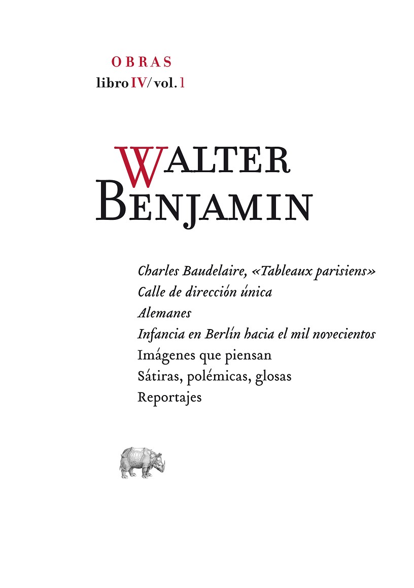 Un nuevo volumen de los once de que consta esta edición de las obras de Walter Benjamin, realizada a partir de la publicada en Alemania por la prestigiosa Suhrkamp Verlag, en edición en este caso de Tillman Rexroth. Incluye Charles Baudelaire: «Tableaux parisiens», Calle de dirección única, Alemanes. Colección de cartas, Infancia en Berlín hacia el mil novecientos, Imágenes que piensan, «Sátiras, polémicas, glosas» y «Reportajes».