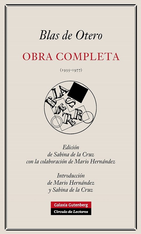 Por primera vez se reúne la «Obra completa» (1935-1977) de Blas de Otero. Este volumen unitario, de verso y prosa, acoge todos los libros que el poeta publicó en vida con otro póstumo, «Hojas de Madrid con La galerna, anticipado por esta misma editorial, y otros dos que dejó inéditos: «Poesía e Historia» (verso) y «Nuevas historias fingidas y verdaderas» (prosa). Una sucinta, y también inédita, «Historia (casi) de mi vida» rinde cuentas de obra y biografía. Un complemento de poemas inéditos y dispersos desde su primera juventud redondea la visión de la poesía oteriana, minuciosamente dispuesta por Sabina de la Cruz, su máxima estudiosa, que ha compulsado manuscritos e impresos para clarificar la obra de uno de los grandes poetas españoles del siglo xx. «Blas incita a un modo de estar o de ser, y engendra, mas nunca por la proximidad tribal de la persona, el raro vínculo de la fidelidad. Cayeron y caerán las mariposas deshojadas de las clasificaciones y las épocas. Blas es, él solo, una entera clasificación. Momento y época. Momento, nunca monumento. ¿Es Blas quizás el antimonumento? ¿Podría aguar con un brusco silencio la fiesta más solemne en su propia memoria, acaso un día declarada de interés nacional? Al fin, cuando ya haya pasado el tiempo falaz del abanico? y el muro blanco sea sólo blanco, Blas se hará más visible. Y así estará, sin pedestal ni altura, como fue y como es, como es difícil ser, secreto, verdadero, insobornable.» JOSÉ ÁNGEL VALENTE