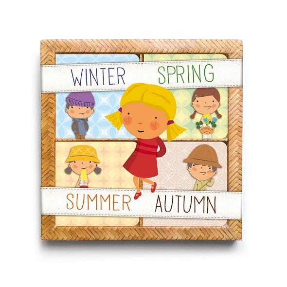 Una simpàtica capsa amb 4 llibres sobre les quatre estacions de l'any que ampliaran el vocabulari dels nens. A lapàgina dreta es plantegen objectes quotidians i propers a l'infant relacionats amb cada estació i, a la de l'esquerra, una frase amb rima que introdueix el concepte.