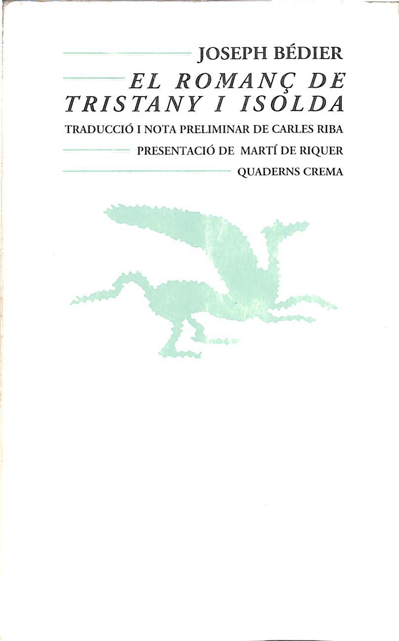 Joseph Bédier (1864-1938), figura cabdal entre els romanistes de primers de segle, teoritzador apassionat sobre els orígens i el sentit de moltes parcel·les de les literatures romàniques medievals, autor del clàssic Les légendes épiques (1907-1914), va ser, per damunt de tot, un extraodinari prosista. En El romanç de Tristany i Isolda (1900) refongué i completà els diversos fragments dels antics romans tristanians del segle XII, per donar-ne una versió d'una força lírica arrabasadora. La traducció de Carles Riba (1893-1959) en va publicar el 1921 representa, com totes les que va fer (tal com ho expressa Martí de Riquer en la presentació d'aquest volum), Un extraordinari enriquiment del català literari, constret amb mà mestra a traslladar des d'allò més eteri i vague a allò més abstracte i subtil, l?expressió popular i l'expressió culta.