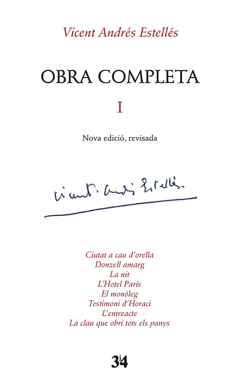 Aquesta Obra Completa -Nova edició, revisada- constitueix un nou projecte d'edició de l'obra estellesiana que conté estudis introductoris, un treball de reorganització cronològica de les obres i d'edició filològica dels poemes estellesians. En aquest primer volum s'apleguen les següents obres: Ciutat a cau d'orella, Donzell amarg, La nit, L'Hotel París, El monòleg, Testimoni d'Horaci, L'entreacte, La clau que obri tots els panys.