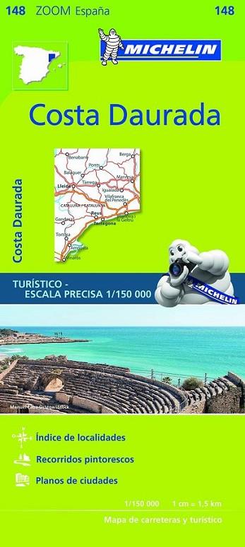 Los mapas de carreteras de la colección Zoom se caracterizan por la gran precisión que aporta su escala detallada, especialmente adaptada para zonas muy turísticas o con una red viaria de alta densidad, incluyendo las nuevas urbanizaciones y zonas industriales. A la claridad, fiabilidad y actualización, características presentes en toda la cartografía Michelin, se le suma una gran cantidad de informaciones prácticas: lugares y monumentos de interés turístico, recorridos pintorescos, zonas para la práctica de deportes y actividades de ocio, ?, además de unos útiles planos de ciudades y un práctico índice de localidades. El Mapa Zoom Costa Daurada, editado a escala 1/150 000, presenta la leyenda en seis idiomas (castellano, portugués, catalán, alemán, francés e inglés), índice de localidades y contiene los planos de Lleida, Tarragona y Tortosa.