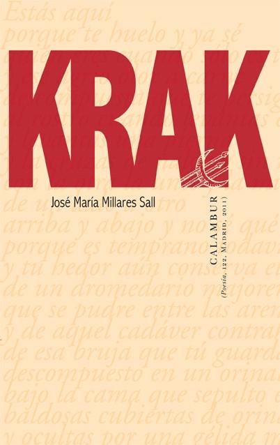 Pero, ¿quién es Krak? Difícil responder. No se trata de un ser cuya entidad específica pueda ser descrita, sino de una criatura extraña, de una fuerza desatada, que siembra el caos a su alrededor. Espíritu, antes que personaje, que deambula por la vida y por la escritura de nuestro poeta, surgido de no se sabe dónde: él, sin embargo, aseguraba haberlo visto, haber mantenido una rara relación de amor-odio con semejante ser, cuando éste ?hacia el otoño de 2008? lo visita por vez primera. Un espíritu que perturba y desordena el buen orden del poema, y que, al propio tiempo, genera disturbios sin cuento en el ya de suyo intranquilo vivir de los últimos días de nuestro escritor. Desde que Krak entra en la vida (y en la poesía) de José María Millares, acomete ?con brutalidad burlona? al ya frágil y debilitado escritor que, gracias a intruso tan impertinente, recibe la fuerza necesaria para cumplir un descarado y descarnado ajuste de cuentas consigo mismo y con la poesía habitual que encuentra en torno suyo: cada poema, un bastonazo inmisericorde. ¿Qué poeta, entre los españoles de esa edad, se ha atrevido a tanto?