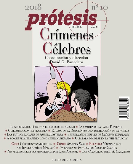 La historia de un país es también la historia de sus crímenes. Y es posible que nada defina tanto a un territorio como su historial criminal. Prótesis, la publicación consagrada al crimen dirigida desde hace quince años por David. G. Panadero, dedica un monográfico sobre «Crímenes célebres». Muchos de ellos españoles: la vampira de la Calle Poniente de Barcelona, el caso de la Dulce Neus, el territorio donde encontró la muerte la niña Asunta Basterra02026; Pero también los hay internacionales, con una guía para seguir las huellas a Jack el Destripador, un repaso a la técnica ideada por Truman Capote para escribir "A sangre fría" o el crimen real de Anne Perry, escritora que de niña asesino a la madre de una de sus amigas. La revista incluye una sección de cine sobre crímenes célebres y sangrientos y relatos originales de autores como Víctor Claudín, León Arsenal o Juan Ángel Cabaleiro.