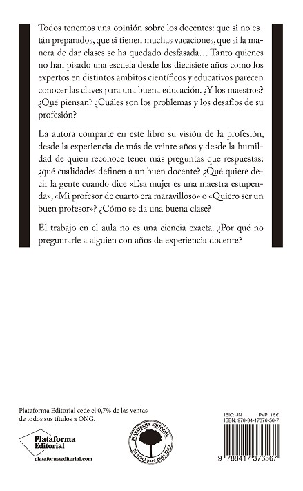 Todos tenemos una opinión sobre los docentes: que si no están preparados, que si tienen muchas vacaciones, que si la manera de dar clases se ha quedado desfasada… Tanto quienes no han pisado una escuela desde los diecisiete años como los expertos en distintos ámbitos científicos y educativos parecen conocer las claves para una buena educación. ¿Y los maestros? ¿Qué piensan? ¿Cuáles son los problemas y los desafíos de su profesión? La autora comparte en este libro su visión de la profesión, desde la experiencia de más de veinte años y desde la humildad de quien reconoce tener más preguntas que respuestas: ¿qué cualidades definen a un buen docente? ¿Qué quiere decir la gente cuando dice «Esa mujer es una maestra estupenda», «Mi profesor de cuarto era maravilloso» o «Quiero ser un buen profesor»? ¿Cómo se da una buena clase? El trabajo en el aula no es una ciencia exacta. ¿Por qué no preguntarle a alguien con años de experiencia docente?