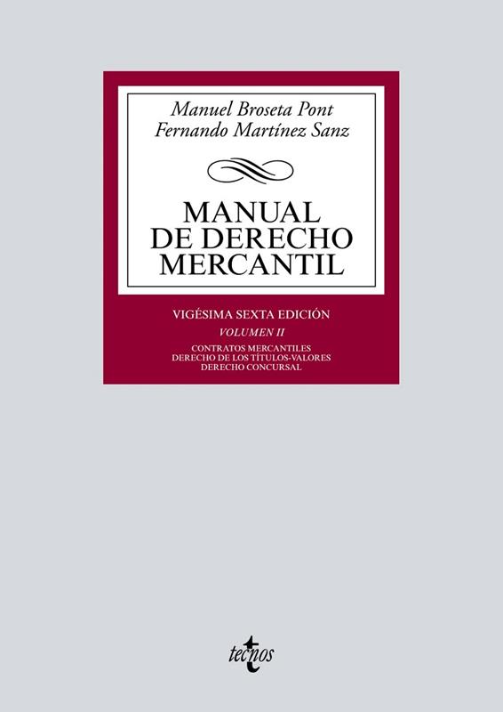 Al igual que el primero, también este segundo volumen de la vigésima sexta edición del Manual de Derecho Mercantil se ocupa de tres aspectos que resultan fundamentales para el estudio de la disciplina. El primero de ellos lo conforma la contratación mercantil y los mercados financieros. El segundo de los bloques de materias lo constituye el derecho de los títulos-valores. Pese a la progresiva reducción que se aprecia en la práctica en el uso de estos instrumentos, se considera que su estudio continúa siendo fundamental para la adecuada comprensión de la disciplina mercantil. En fin, el volumen se cierra con los capítulos dedicados al Derecho concursal. Con todo ello se aspira a ofrecer una visión sistemática y comprensible del Derecho mercantil actual, cada vez más complejo, pero sin perder de vista que, ante todo, se trata de un manual universitario, que ha de suministrar al alumno las bases para el estudio razonado de la disciplina, antes que un simple repertorio de datos o preceptos legales.