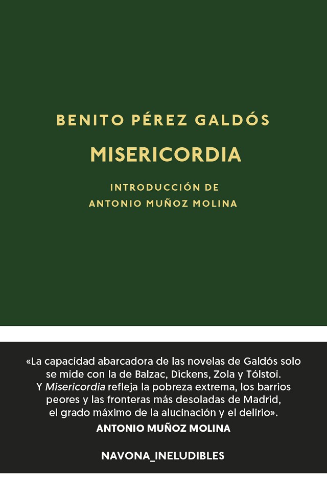 Dramaturgo, cronista, político y, sobre todo, novelista, Benito Pérez Galdós (1843-1920) fue sin duda uno de los más destacados representantes del realismo español y Misericordia, una de sus obras más universales. En ella, nos dice el propio autor, “me propuse descender a las capas ínfimas de la sociedad matritense, describiendo y presentando los tipos más humildes, la suma pobreza, la mendicidad profesional, la vagancia viciosa […] Para esto hube de emplear largos meses en observaciones y estudios directos del natural, visitando las guaridas de gente mísera o maleante que se alberga en los populosos barrios del sur de Madrid […] [y] penetrar en las repugnantes viviendas donde celebran sus ritos nauseabundos los más rebajados prosélitos de Baco y Venus”. El resultado es una novela emblemática sobre la marginación, a la vez que una crítica atemporal a la sociedad, que hoy presentamos en nuestra colección Ineludibles para conmemorar el centenario de la muerte de Benito Pérez Galdós.