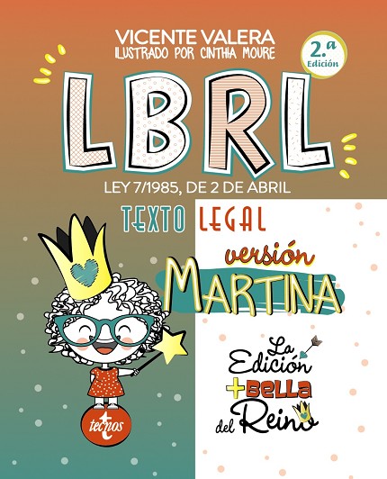 En esta edición de la Ley de Bases de Régimen Local, versión Martina, con anillas y a color, goma de cierre y solapas interiores, Vicente Valera, junto a la diseñadora gráfica Cinthia Moure, ofrece una versión fácil estudio sobre dicha norma de carácter básico, versión que favorece el empleo de la memoria visual, algo tradicionalmente poco empleado en el mundo jurídico. Como bien es sabido esta norma tiene un papel destacadísimo en la totalidad de programas oficiales /oposiciones de ámbito Local (Ayuntamientos y Diputaciones especialmente) y, en consecuencia, sin su dominio absoluto se hace prácticamente imposible superar los mismos.
