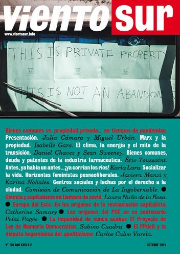 En este número dedicamos el Plural a ?Bienes comunes vs. propiedad privada?en tiempos de pandemia?, coordinado y presentado por Julia Cámara y Miguel Urbán.En este número dedicamos el Plural a ?Bienes comunes vs. propiedad privada?en tiempos de pandemia?, coordinado y presentado por Julia Cámara y Miguel Urbán. Colaboran Isabelle Garo (sobre Marx y la propiedad), Daniel Chavez y Sean Sweeney (sobre la transición ecosocial), Éric Toussaint (sobre la deuda y las patentes de la industria farmacéutica), Karla Lara (reivindicando la defensa de los ríos desde Honduras), Javiera Manzi y Karina Nohales (apostando por la socialización de la vida en un horizonte postneoliberal), y la Comisión de Comunicación de La Ingobernable (sobre la experiencia de los Centros Sociales y las luchas por el derecho a la ciudad). En El desorden global, Laura Nuño de la Rosa reflexiona sobre las relaciones entre ciencia y capitalismo en tiempos de covid, y Catherine Samary nos ofrece un balance del proceso de restauración capitalista en Europa oriental. En Futuro anterior, con ocasión del centenario del PCE Pelai Pagès rememora el contexto y los debates en torno a la fundación de este partido y su evolución hasta 1936. En Aquí y ahora, Sabino Cuadra hace un balance de la legislación sobre la memoria histórica y una valoración del nuevo proyecto de Ley de Memoria Democrática, y Carlos Calvo Varela analiza la especificidad del PP de Galicia y su explotación del apoliticismo en el mundo rural. En Miradas, Alejandro Calviño nos ofrece imágenes que hablan con lenguaje arquitectónico, y en Voces podemos leer parte del poemario ?Z? de Jorge Riechmann. Finalmente, como siempre, en Subrayados podéis leer seis reseñas de libros