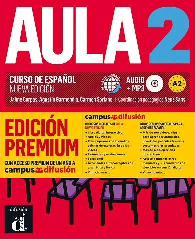 Edición Premium del Libro del alumno de nuestro método Aula Nueva edición con código de acceso premium de un año a Campus Difusión. Aula Nueva edición es el curso de español orientado a la acción que hace del aula el contexto perfecto para el aprendizaje de la lengua… por su variedad de actividades, que tienen en cuenta los diferentes estilos de aprendizaje por su equilibrio entre el trabajo de comprensión, de producción y de interacción por su tratamiento de la gramática, riguroso y significativo por su lenguaje gráfico claro y atractivo porque ofrece numerosos documentos auditivos porque cada unidad didáctica incorpora un vídeo porque se complementa con una plataforma de recursos digitales Aula 2 Nueva edición es un manual compacto; es decir, en un mismo volumen se incluyen: el libro del alumno el cuaderno de ejercicios (Más ejercicios) un CD con las audiciones la agenda del estudiante