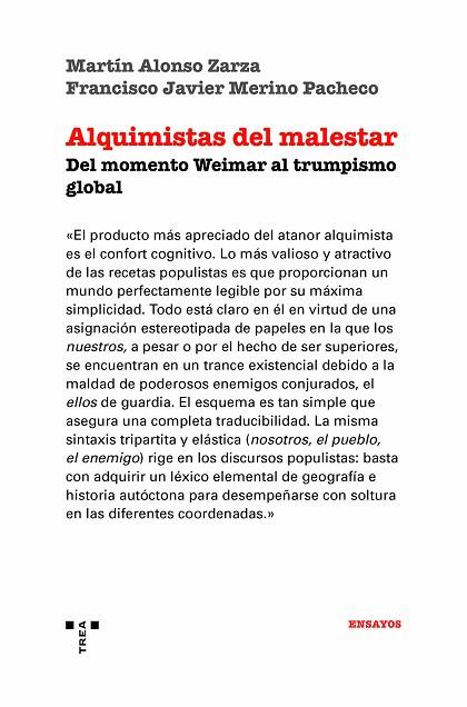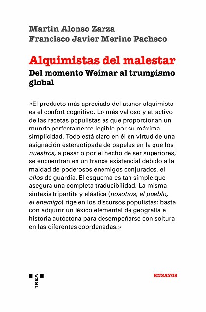 De Londres a Roma, de Budapest a Jerusalén, de París a Liubliana… y quizás también a la Barcelona del Procés, un fantasma recorre el mundo. Es el fantasma de un malestar acompasado a la decadencia del orden mundial pergeñado tras la derrota de los fascismos en la segunda guerra mundial, en un mundo en el que resuenan tambores de desastre, y crece la inclinación —de la que puede trazarse una historia de la que forman parte Auschwitz o Srebrenica— a refugiarse en la casamata del identitarismo exclusivista. Ese malestar, esa inclinación, han encontrado alquimistas capaces de encauzarlos en su provecho. «Es como si nos encontráramos en una plataforma petrolífera, encima de todos esos yacimientos de energía acumulados […]. Todo lo que tenemos que hacer es averiguar dónde están, perforar y abrir la válvula para liberar la presión», metaforiza Dominic Cummings, el estratega político del Brexit, quien Francisco Javier Merino Pacheco y Martín Alonso Zarza citan en este libro. ¿Vivimos un momento Weimar; una crisis democrática equiparable en alguna medida a la que sentenció a aquella República avanzada y esperanzadora, pero que no supo detener la gestación, en su seno, del monstruo nacionalsocialista? ¿Nos hablan del mismo acontecimientos como el asalto trumpista al Capitolio de Washington el 6 de enero de 2021? Tal es la pregunta que trata de esclarecer esta obra escrita a cuatro manos, uno de cuyos capítulos se abre con esta otra cita de Lyndon B. Johnson: «Si puedes convencer al hombre blanco de más baja posición de que es mejor que el mejor hombre de color, no se dará cuenta de que le estás robando la cartera. Demonios, ofrécele a alguien a quien menospreciar y te la entregará él mismo».