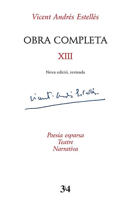Aquesta Obra Completa -Nova edició, revisada- constitueix un nou projecte d'edició de l'obra estellesiana que conté estudis introductoris, un treball de reorganització cronològica de les obres i d'edició filològica dels poemes estellesians. El tretzè volum, a cura de Jordi Oviedo, està organitzat en tres eixos principals: la «poesia esparsa», que reuneix tot de poemes dispersos així com tres poemaris inèdits: Homenatges, Homenatge a Ronsard i Pinacoteca; el «teatre», que presenta les peces reunides anteriorment a Oratori del nostre temps i al llibre pòstum Dos drames i una farsa; i la «narrativa», que recull obres com El cementeri o El coixinet.
