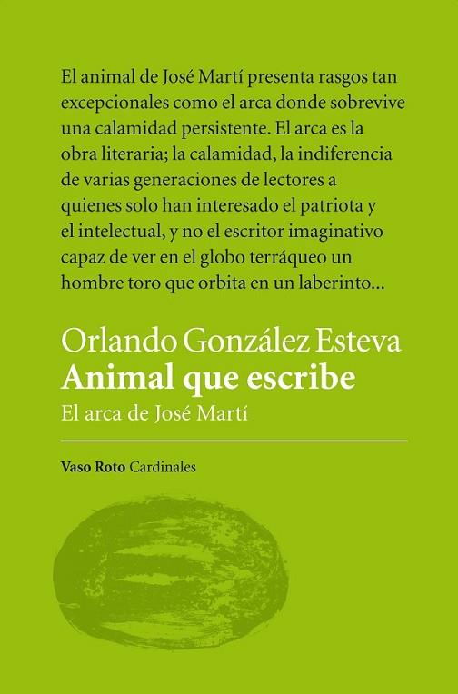Animal que escribe es una invitación a redescubrir a José Martí (1853-1895) y dar rienda suelta a la imaginación a partir de su carácter visionario y su sensibilidad extrema. No es el Martí oficial sino uno poco menos que inédito e insólito, el poeta capaz de preocuparse por el destino de una mosca, admirar la delicadeza del murciélago que mata a una luciérnaga pero salva su luz, distinguir las reses más aptas para la maternidad de las más voluptuosas, elogiar el encaje que bordan los cangrejos sobre la arena húmeda, identificar al Quijote en un insecto, divisar una ostra con alas y hasta abordar algún tema grave con una nota de humor.