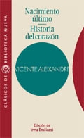 La poesía de Vicente Aleixandre (1898-1984) constituye una de las cumbres de la poesía moderna en español, reconocida con el Premio Nobel en 1977. El lector de este volumen apreciará cómo el poeta pasó desde una poesía cósmica, patente en Nacimiento último (1953), libro de compleja y larga escritura, hasta una poesía de sentido humano, ejemplificado por Historia del corazón (1954), obra que recibe la influencia de los nuevos poetas a la vez que influirá sobre ellos. La profesora Irma Emiliozzi, catedrática de la Universidad Nacional de Lomas de Zamora (Buenos Aires), ha establecido, en la importante introducción de este volumen, la génesis de ambos libros, a través de las distintas versiones de los poemas, las páginas dispersas o las entrevistas olvidadas con el poeta, además de estudiar críticamente la escritura amorosa de un período fundamental de la poesía aleixandrina.