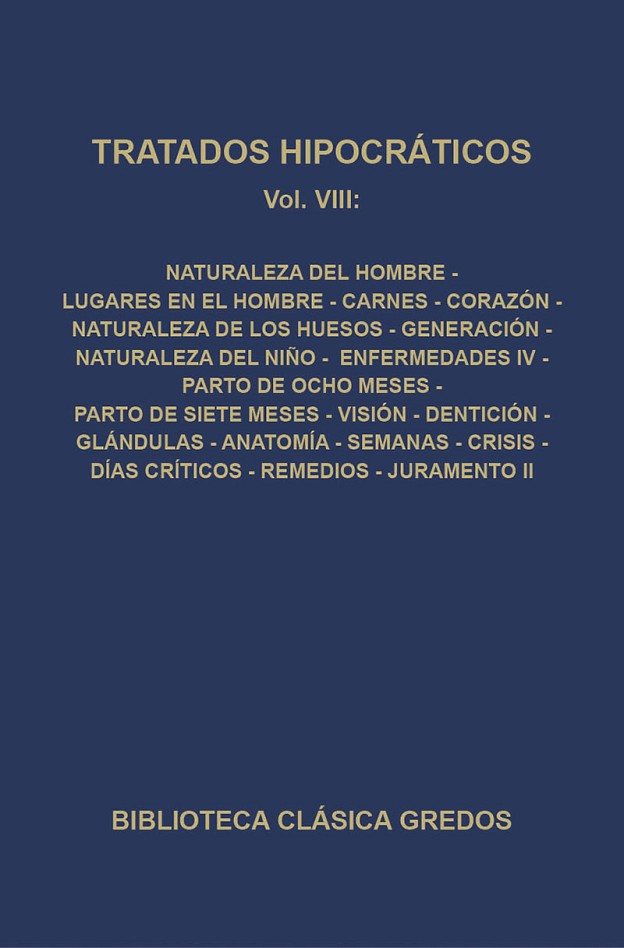 Con este volumen concluye la publicación en castellano de los "Tratados hipocráticos", es decir, de los textos de medicina antigua atribuidos tradicionalmente a Hipócrates de Cos (s. V a. C.), que constituyen la primera biblioteca científica de Occid